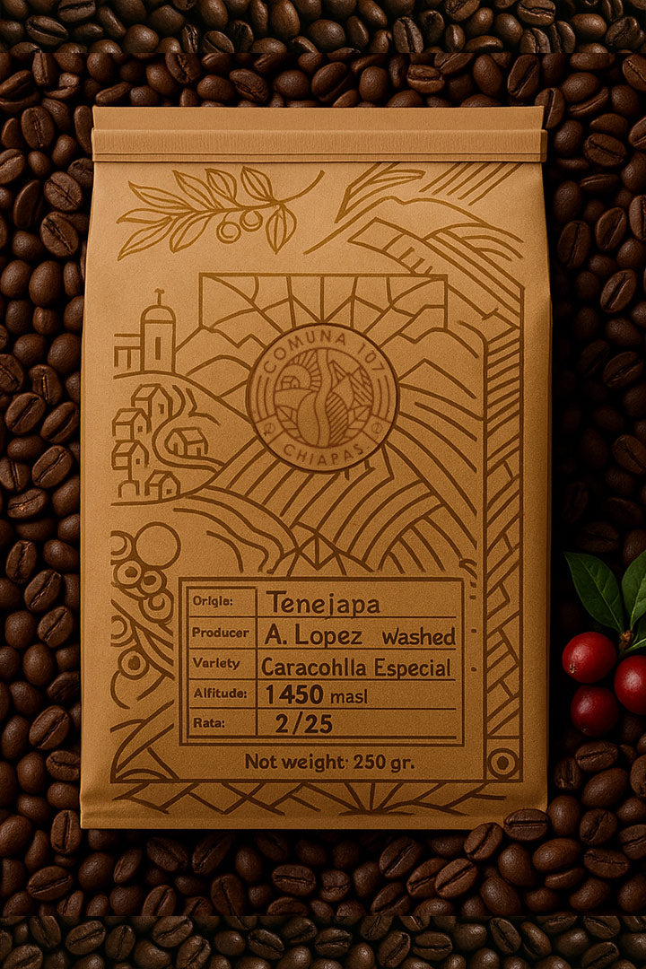 Este café de variedad Garnica proviene de Tenejapa, Chiapas, cultivado a 1,700 m.s.n.m. y de proceso Honey.